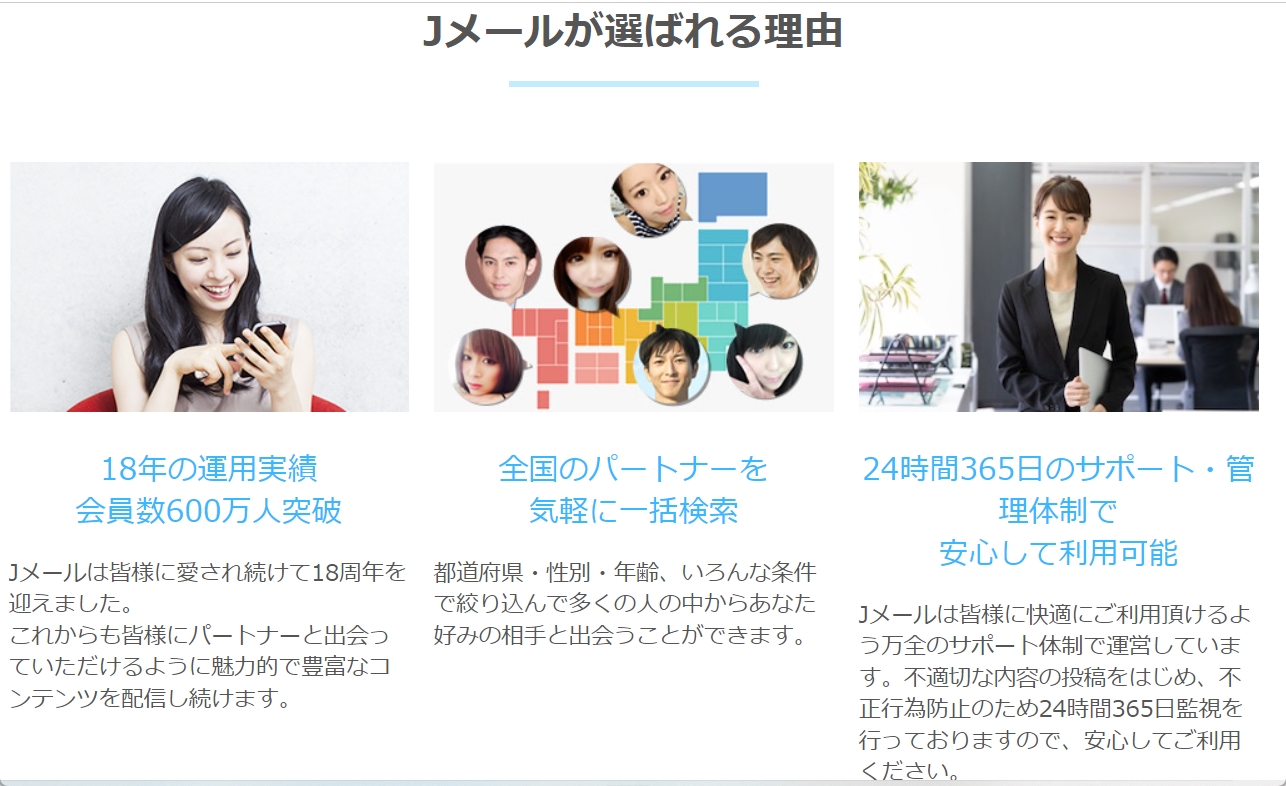 jメールは全国展開している出合いサイトですが、九州方面を中心に広報活動を展開しており、特に西日本の出会いに強く20年ほどのキャリアを誇る老舗の出会い系サイトです。 長く運営されているので、信頼感があります。